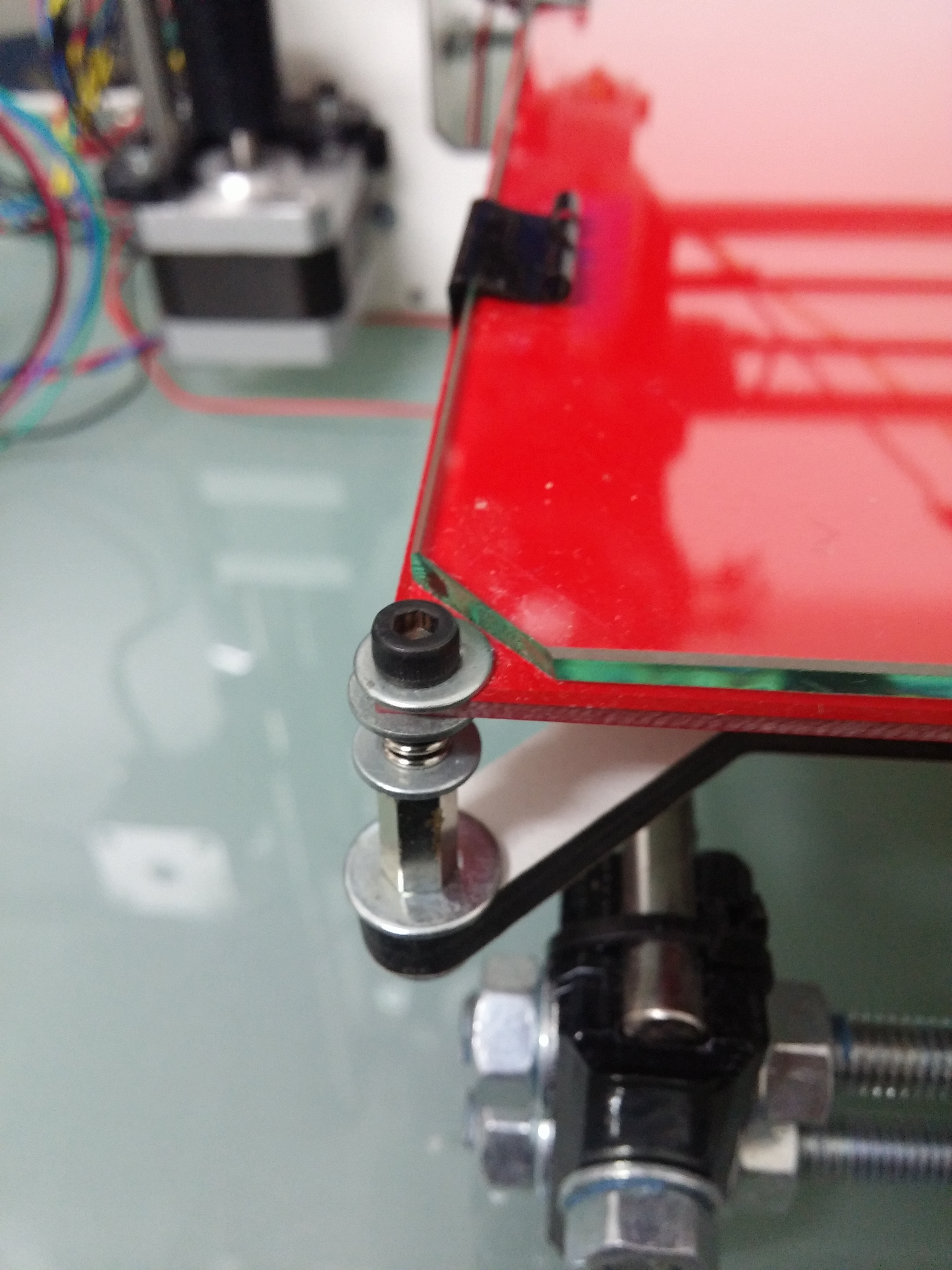 The 3mm was taken from a broken all-in-one printer’s scanner bed. I cut it to shape myself with a glass cutter and to maximize the printing area, I cut the corners to make room for the bolt heads and washers holding the bed.