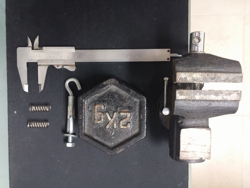 Conveniently, I had a 2kg scale weight just lying around (we know that gravity pulls the weight with approx. 19.6N of force), a threaded hook, vice grips and a caliper.