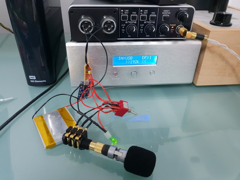 To test my noise theory, I replaced the USB power input with a battery. If the noise is coming from the power input and not the mic or circuit, the battery should eliminate it.