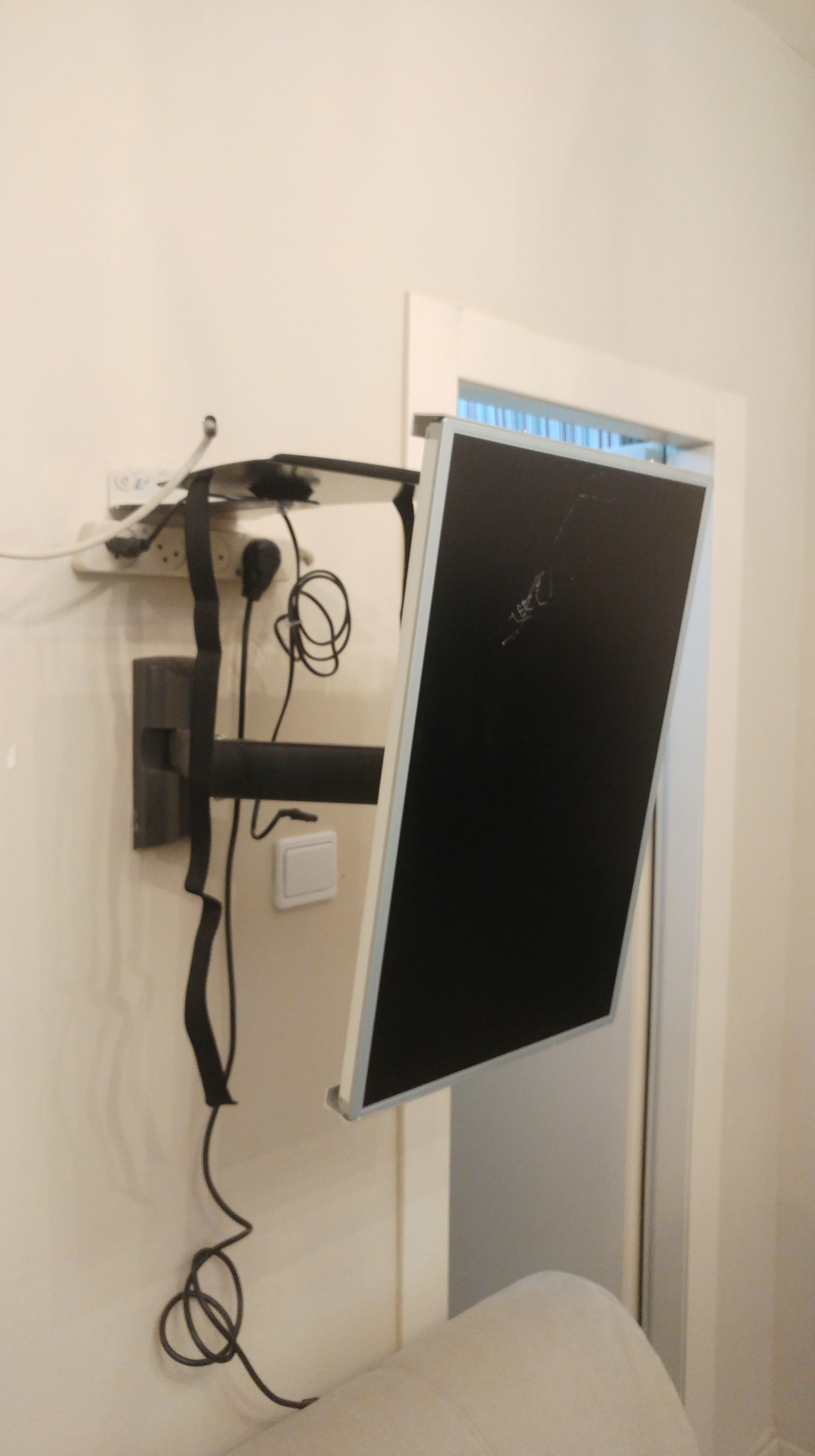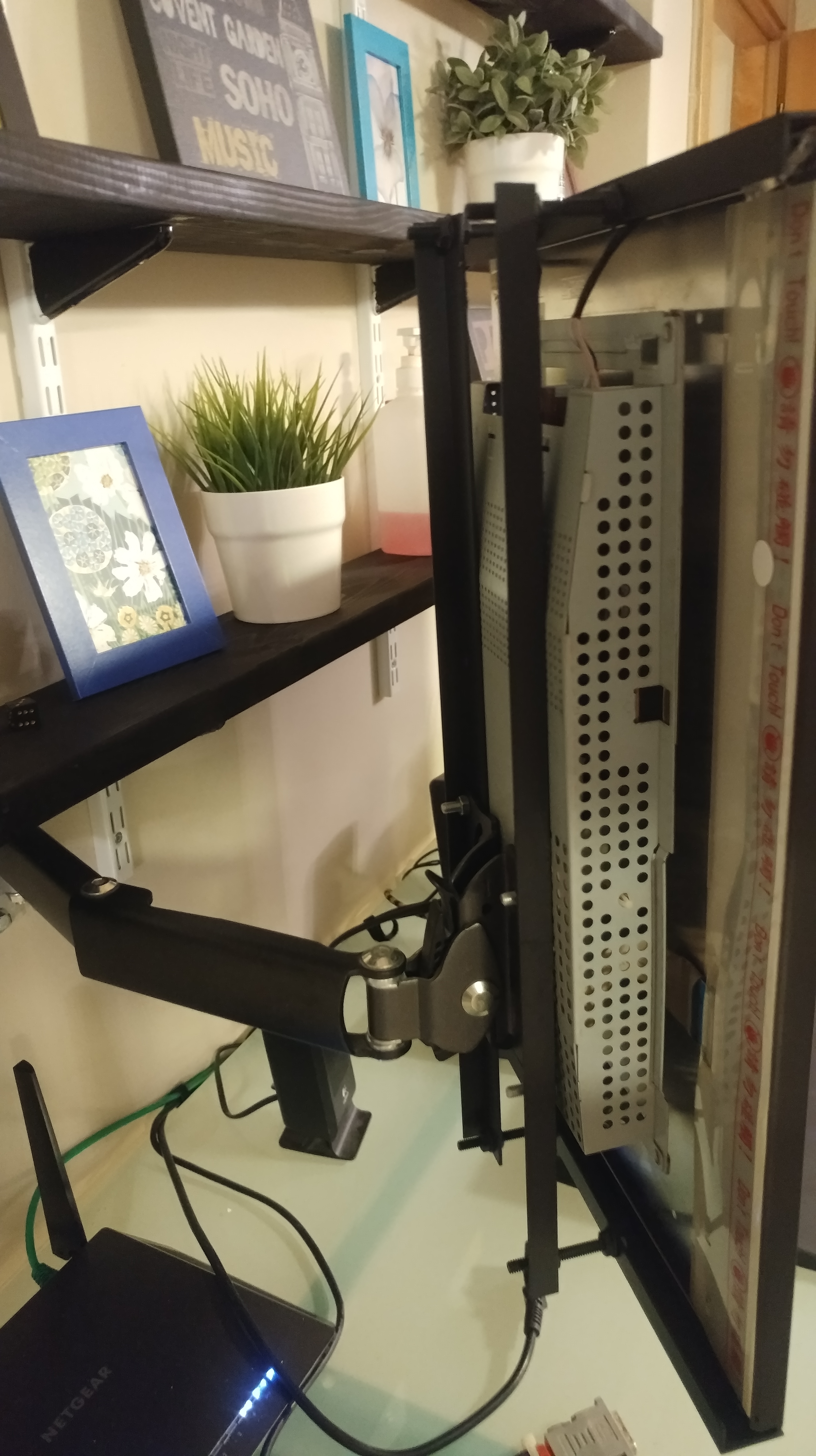 I had an old Samsung LCD screen that has a small leg with very little adjustment and no other mounting holes or hardware. The problem was that I wanted to use it as a vertical secondary display and for that, I needed to mount it much higher than what its leg allows.