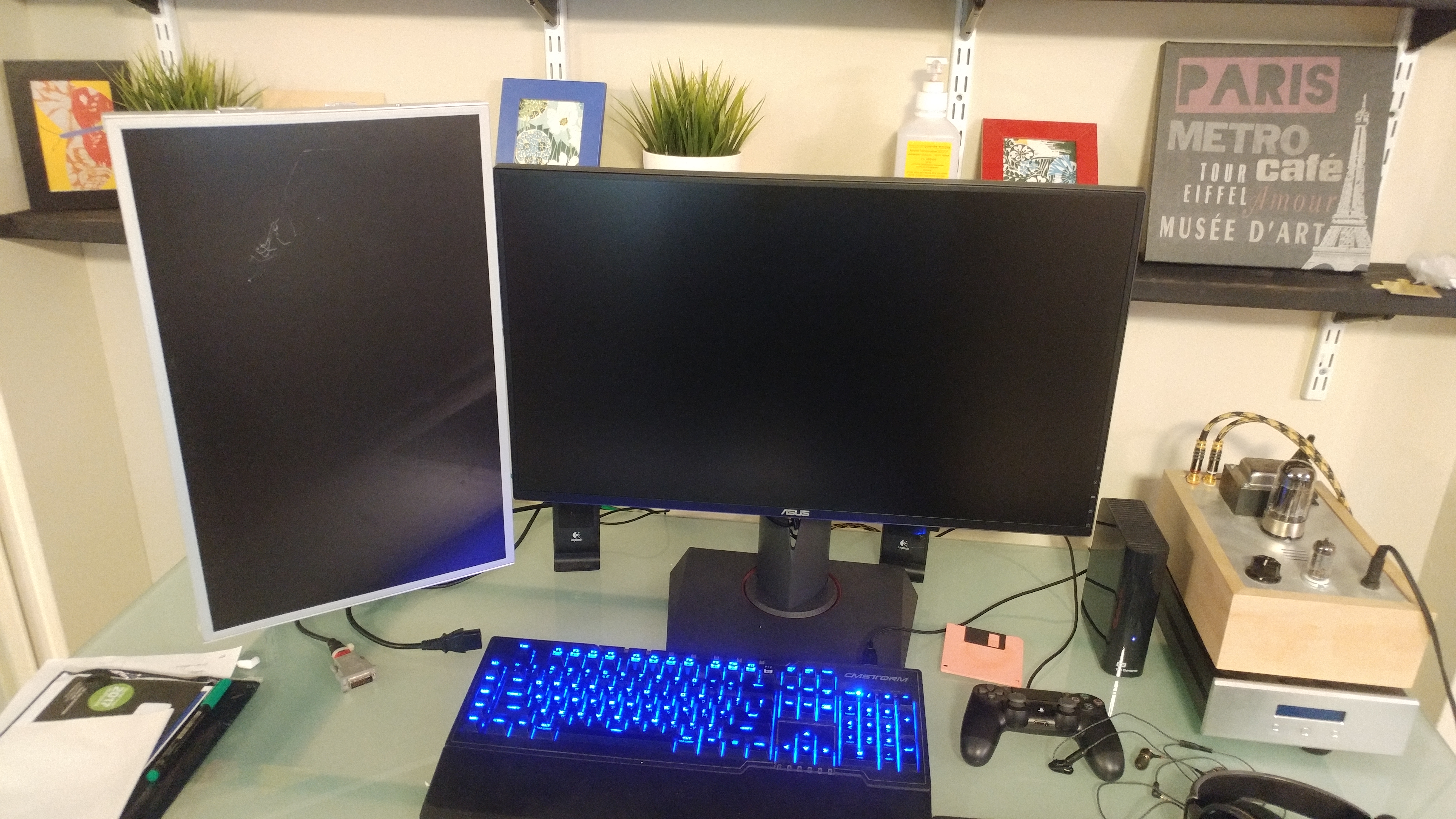 I recently moved my computer to another room and mounted both screens on a dual arm desk mount. The new mount is a little wider, so it sits on top of the aluminium bracket, but it’s more than sturdy enough.