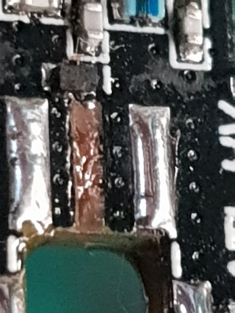 Replacing the resistor wasn’t easy as the pads are very small, but I managed to use both pads together to give a strong enough bond (this didn’t matter electrically that the pads were shirted because one side of the resistor only went to the connector pad which is no longer connected to anything)
