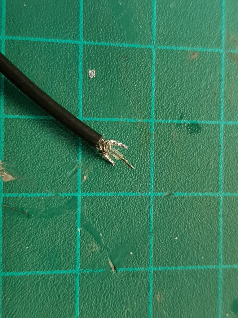 I took a pigtail and carefully peeled the outer insulation, without cutting the shielding. Then I exposed the center wire and shaped the shielding to fit the pads on the board.